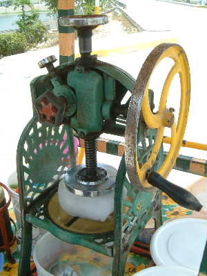 "........... en bij het verlaten van het dorp een man die schaafijs verkoopt en daarvoor een fraaie machine heeft ontwikkeld die me aan een wijnpers doet denken. “Granizado” heet dat hier, “frio frio” in de Dominicaanse Republiek, “piragua” in Puerto Rico, “raspado” in Panama, “schaafijs” op de Rotterdamse Kruiskade. ..............."