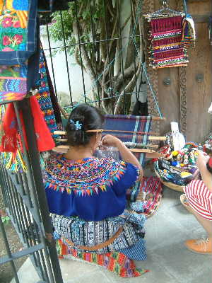 "........... In de entree zit een Maya vrouw op de grond tussen haar koopwaar, ze heeft een klein weefgetouw op schoot. Dat komt me bekend voor. Niet omdat ik het eerder zag, maar omdat het door Rigoberta Menchú in haar boek wordt beschreven als iets dat een vast onderdeel is van de opvoeding van een traditioneel Maya meisje. ..............."