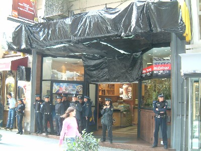 “...........Bij de McDonald’s om de hoek staan meer politiemannen voor de deur dan er binnen klanten zitten. Ik kan me best voorstellen dat zo’n rijtje in kogelvrije vesten geklede mannen de eetlust benemen. De normaal zo onbeschaamd “McDonald’s” uitstralende lichtbak boven de ingang is afgeplakt met zwart plastic. .............."